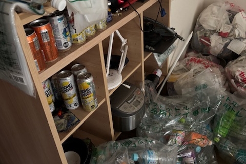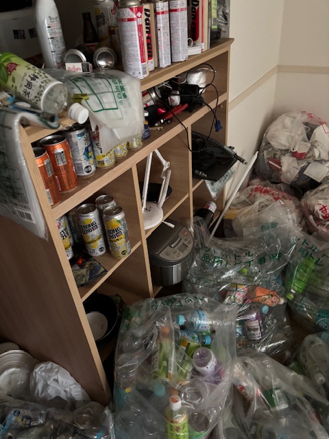 現場を確認すると、床全体がペットボトル・缶・レトルト食品パックで覆われ、収納棚の中や上にも飲料缶・調理器具・家電小物が積み重なっている状態でした。